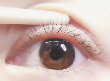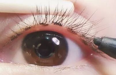 画眼线前,先用手指撑住眼皮,露出睫毛根部,眼线要贴近睫毛根部描画才自然。要点是一点一点将睫毛缝隙填满。