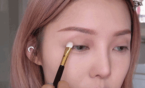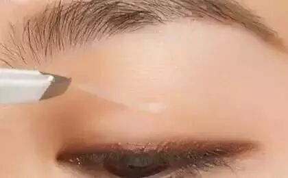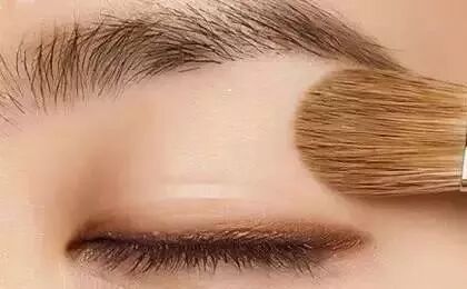 刷上打底色眼影,对美目贴进行弱化。如遇容易飞起的眼头和眼尾处,可蘸取少量睫毛胶进行粘合固定。