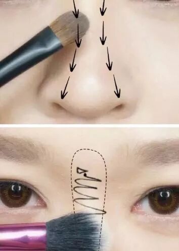 第一步:用扁头眼影刷沿着鼻梁两侧如同图中箭头指示一般从眉头处用“描”的形式,晕染到鼻头及鼻翼中间凹陷处,切勿化歪,否则鼻梁看起来就是歪的了。