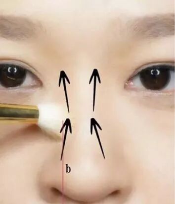 第三步:高光刷沾取高光粉从鼻头处单向刷去印堂的位置,将阴影粉的结块柔和一下。进一步的增高鼻梁的方法